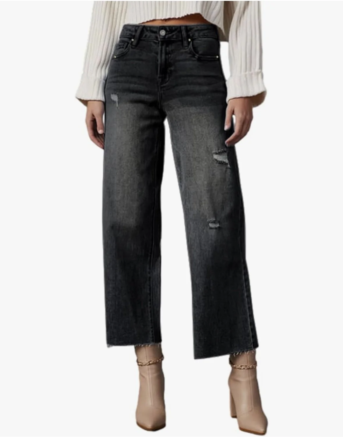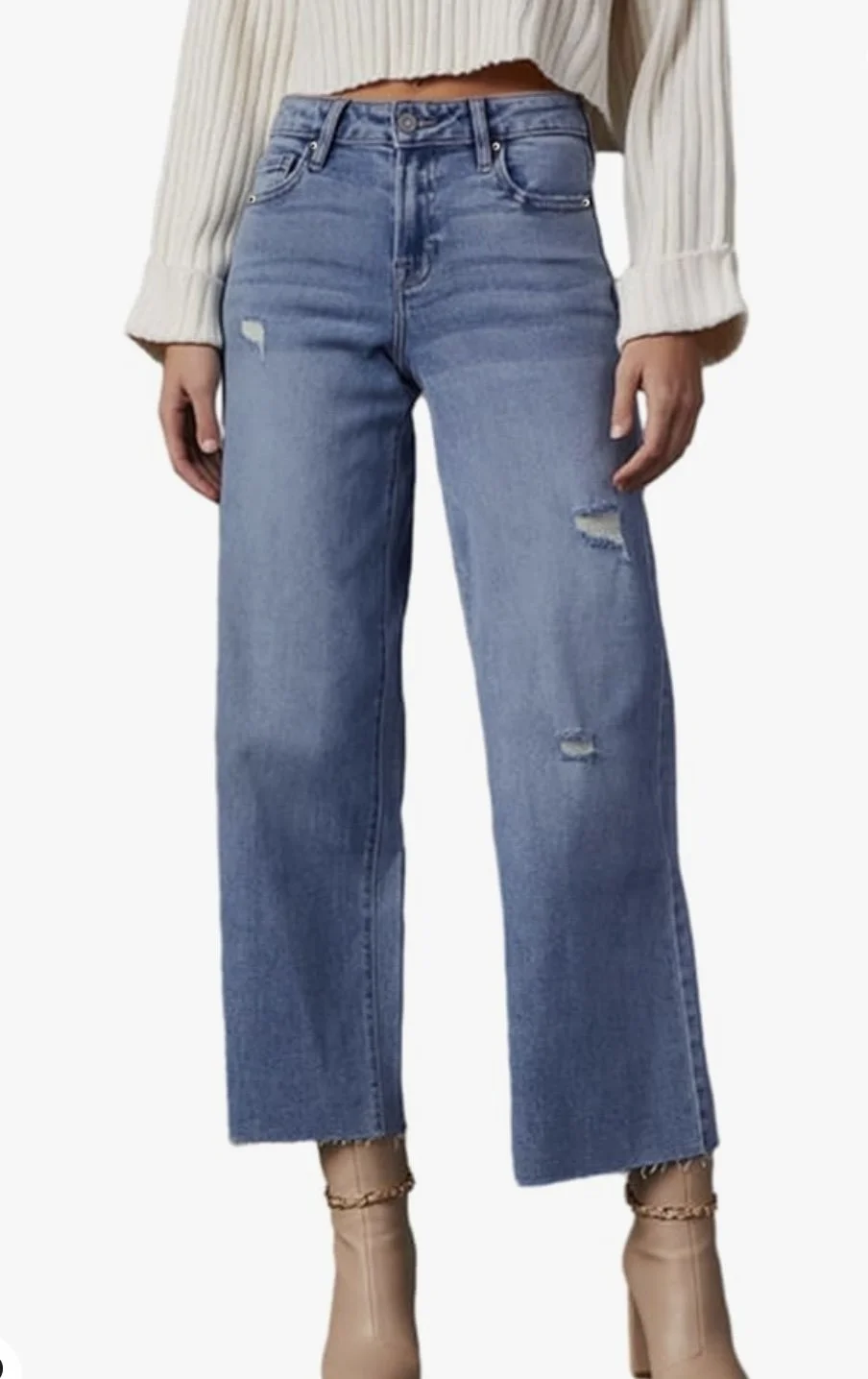 Wide leg cropped jeans have quickly become a favorite of mine. This pair has a perfect amount of distressing